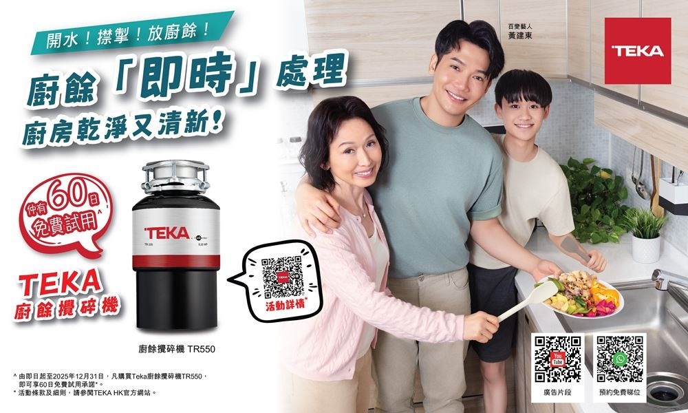• 購買Teka廚餘攪碎機TR550,即可享有60日免費試用,優惠受條款及細則約束。(詳情)